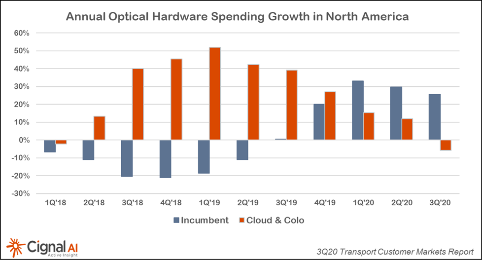Expenditures by North American cloud and colocation operators on optical and packet transport equipment declined 20 percent year over year in the third quarter of 2020 (3Q20), while incumbent operator spending increased 2 percent, according to the 3Q20 Transport Customer Markets Report from market research firm Cignal AI. It’s quite important that incumbent operator spending grew while cloud and colocation operator spending declined during 2020.