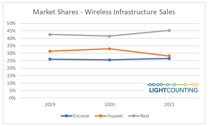 This environment is divided into two spheres of influence, China versus the West and its allies. Both Ericsson and Nokia gained market share at the expense of Huawei and ZTE in 4Q21:
