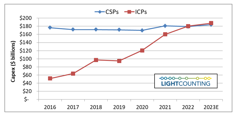 Amazon and other cloud companies plan to moderate their investments in 2023 and beyond, even if there is no economic recession. The Cloud companies benefited from the COVID-19 pandemic, but they were forced to reassess their plans at the end of 2022, as growth slowed. Their capex almost doubled between 2019 and 2022 but future investments will be more conservative. We expect the Top 15 ICP’s capex to be up only 4% in 2023, essentially flat, after several years of double-digit growth. Investments in AI infrastructure will remain a priority.