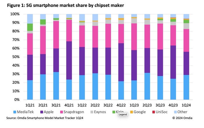 MediaTek’s 5G smartphone market share has increased from 22.8% in Q1 2023 to 29.2% in Q1 of this year. By comparison, Qualcomm Snapdragon’s market share dropped from 31.2% to 26.5% over the same period, according to Omdia.
