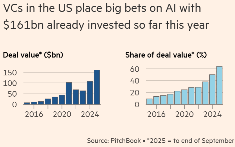 U.S. venture capitalists (VCs) have poured $161 billion into artificial intelligence startups this year — roughly two-thirds of all venture spending, according to PitchBook — even as the technology’s commercial payoff remains elusive. VCs are on track to spend well over $200bn on AI companies this year.