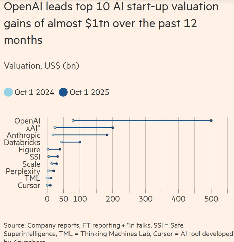 Most of that money has gone to just 10 companies, including OpenAI, Anthropic, Databricks, xAI, Perplexity, Scale AI, and Figure AI, whose combined valuations have swelled by nearly $1 trillion, Financial Times calculations show. Those AI start-ups are all burning cash with no profits forecasted for many years.