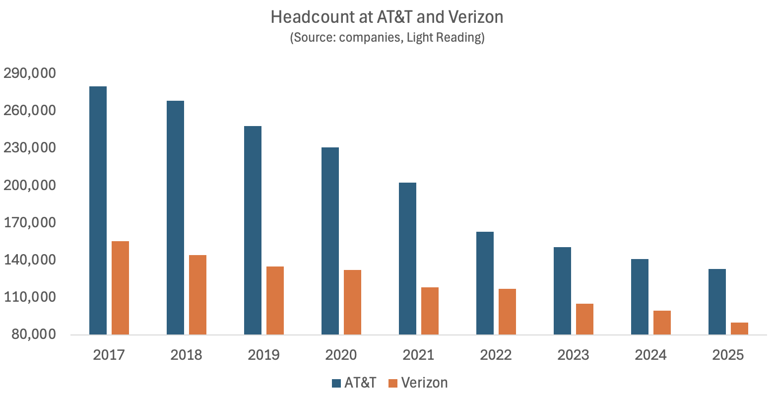 That total net loss of 17,700 jobs at AT&T and Verizon was equal to about 7% of the combined workforce at the end of 2024. Last year’s job losses were not an isolated event but the continuation of a decade-old trend that has gutted the telco workforce. At its high point for staff numbers in 2017, AT&T employed as many as 280,000 people, including those it would acquire with its $85 billion takeover of Time Warner. Around 147,000 jobs have subsequently disappeared, showing the workforce has more than halved in just eight years.