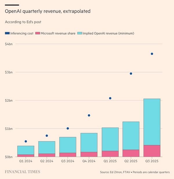 OpenAI appears to have spent more than $12.4bn at Azure on inference compute alone in the last seven calendar quarters. Its implied revenue for the period was a minimum of $6.8bn. Even allowing for some fudging between annualised run rates and period-end totals, the apparent gap between revenues and running costs is a lot more than has been reported previously.