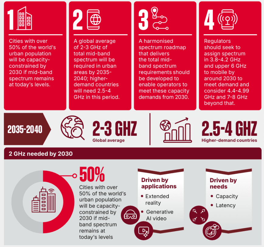 Telecom operators should develop a long-term spectrum roadmap informed by these findings, prioritizing 2-3 GHz globally, with targets up to 4 GHz in high-demand markets. Key actions include: