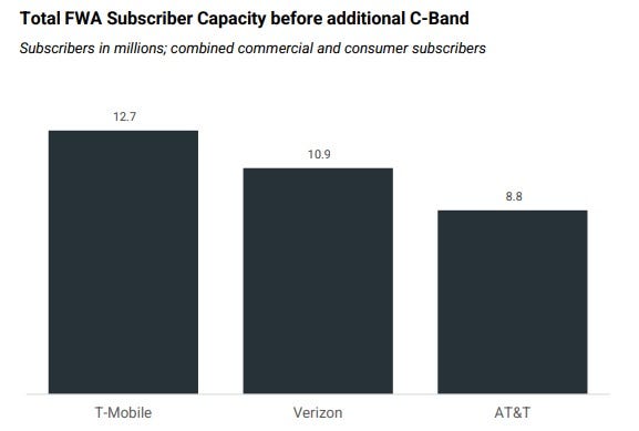 New Street expects U.S. network service providers to have 32 million to 36 million FWA subscribers in the coming years. However, the forecast expects a slight slowdown in FWA sub adds in 2026, coming in just below the range of 3.7 million to 3.8 million seen over the past three years. Next year, New Street expects FWA subscriber adds of 3.6 million (1.7 million for T-Mobile, 1 million for Verizon and 900,000 for AT&T). The analysts estimate that the carriers currently have enough capacity to support about 32 million FWA subs, estimating that carriers have already consumed about 55% of total capacity with new subs. That estimate does not include potential capacity coming from the upcoming auction of upper C-Band spectrum. That auction could provide capacity for another 4 million or so additional FWA subs, New Street said.