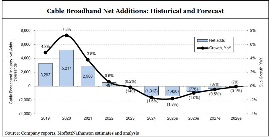 - MoffettNathanson sees flattish cable broadband subscriber growth for the next couple of years, with a small gain in 2028. The firm projects subscriber losses in legacy markets will be eventually offset by gains from rural expansions and edge-out builds. “The conclusion for the two [Comcast and Charter] is about the same: even a near worst-case scenario yields roughly flat subscribership over the next five years or so,” Moffett wrote. “That’s a far cry from the doomsday scenarios we typically hear for the bear case.”