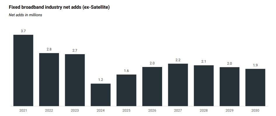 - In February 2025, Wolfe Research estimated that total industry net broadband additions for 2025 would be under 2 million, with cable providers bearing much of the slowdown.