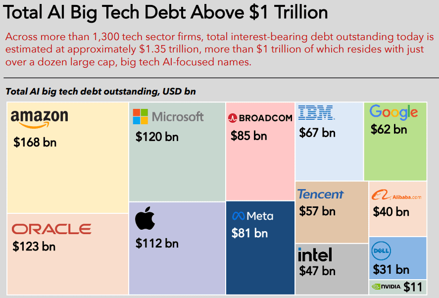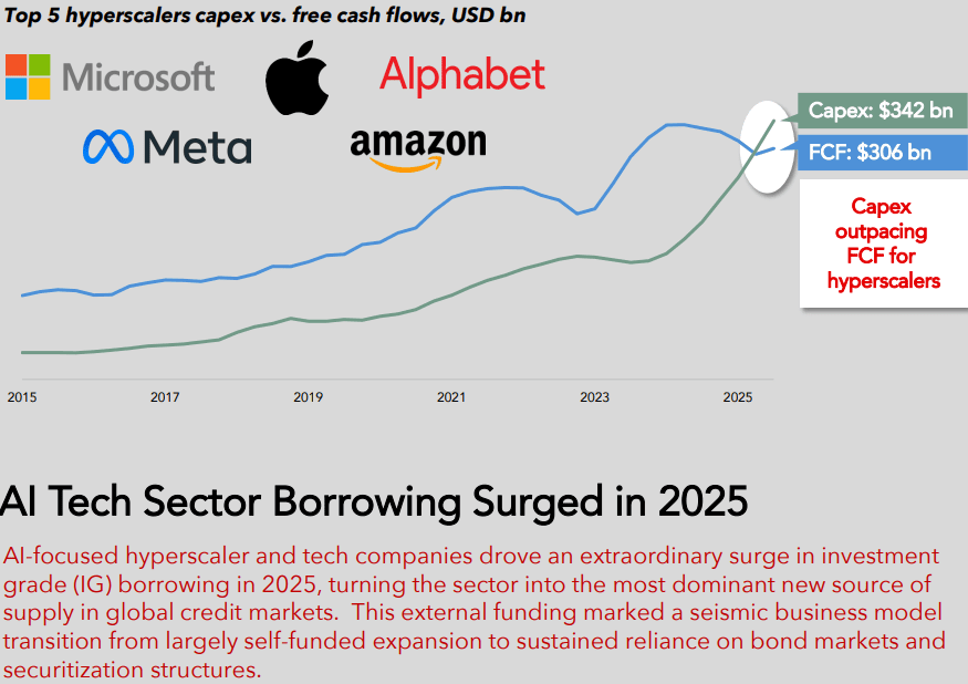 Hyperscaler capex for the “big five” (Amazon, Alphabet/Google, Microsoft, Meta/Facebook, Oracle) is now widely forecast to exceed $600 bn in 2026, a 36% increase over 2025. Roughly 75%, or $450 bn, of that spend is directly tied to AI infrastructure (i.e., servers, GPUs, datacenters, equipment), rather than traditional cloud. Hyperscalers are increasingly leaning on debt markets to bridge the gap between rapidly rising AI capex budgets and internal free cash flow, transforming historically cash-funded business models into ones utilizing leverage, albeit with still very strong balance sheets. Aggregate capex for “the big five”, after buybacks and dividends are included, are now above projected cash flows, thereby necessitating external funding needs.