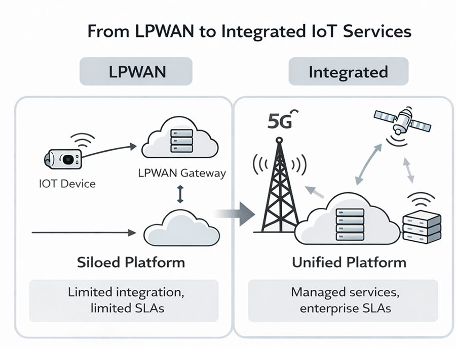The commercial implications of this transition are further illustrated in Figure 2, which contrasts siloed LPWAN deployments with integrated mobile and satellite IoT services delivered through a unified network core.