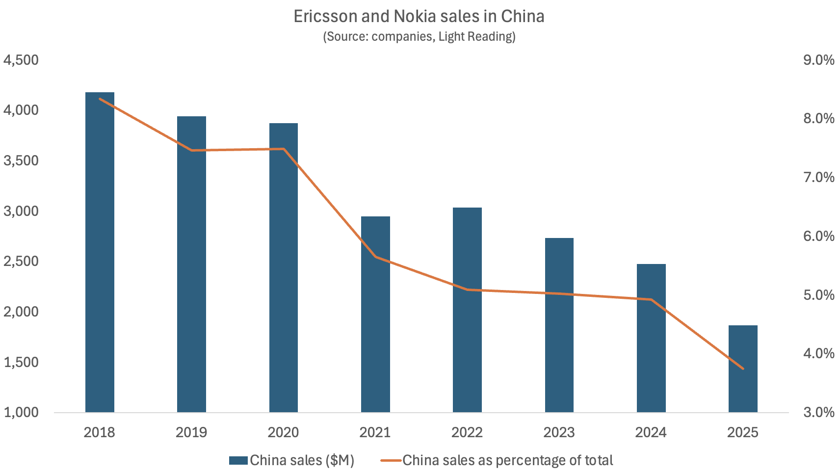 Ericsson recently published earnings release for the final quarter of 2025 puts China revenues at just 3% of total sales last year. This would equate to revenues of 7.1 billion Swedish kronor (US$798 million). Based on a rounding range of 2.5% to 3.4%, it works out to be between SEK5.92 billion ($665 million) and SEK8.05 billion ($905 million) – down sharply compared with the SEK10.2 billion ($1.15 billion) Ericsson made in 2024, according to that year’s Ericsson annual report.