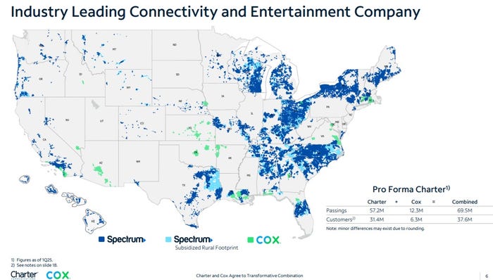 It’s not immediately clear how Cox’s network upgrade plans will change following the combination. Cox recently announced it would deploy a virtual cable modem termination system (vCMTS) from Vecima. Charter has tapped Harmonic as its initial vCMTS partner for a multi-tiered hybrid fiber/coax (HFC) upgrade.