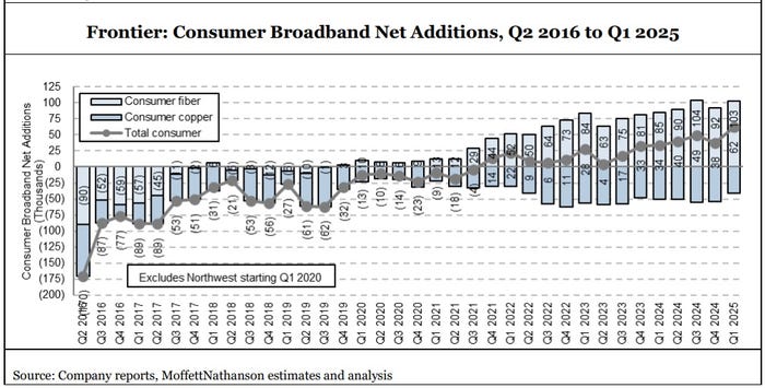 Frontier added 103,000 residential fiber broadband customers in Q1 2025, beating the 95,000 expected by MoffettNathanson (see graph below). Frontier’s residential fiber additions in the quarter were just shy of the record 104,000 it added in Q3-2024. The fiber facilities based carrier gained a record 59,000 net broadband customers in the period, which included losses of legacy copper subscribers.