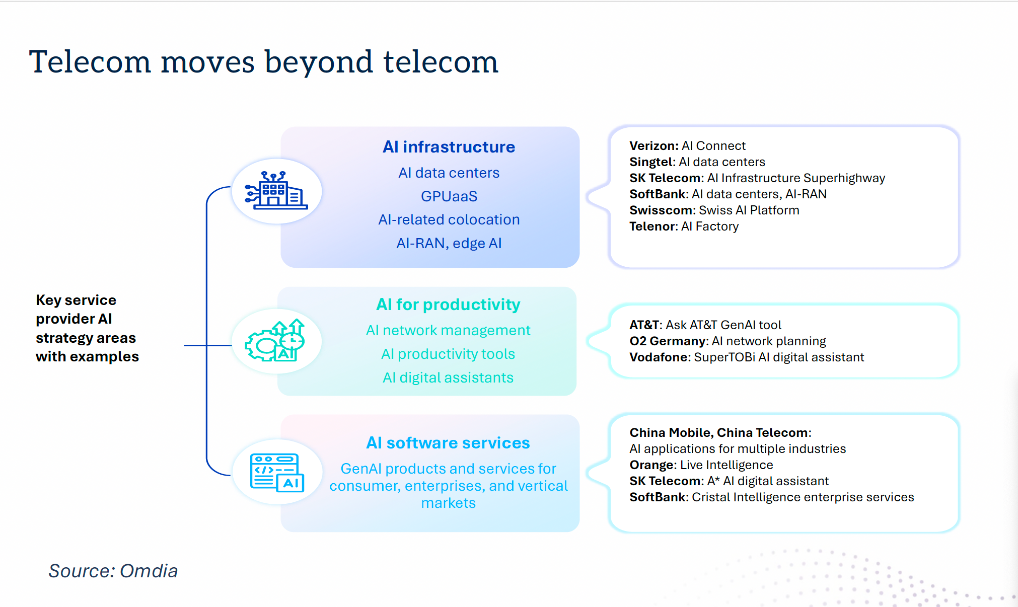 “Telecom is moving beyond telecoms,” with a number of new AI strategies in place. For example, telcos are increasingly providing AI infrastructure in their data centers, offering GPU as-a-service, AI-related colocation, AI-RAN and edge AI functionality.