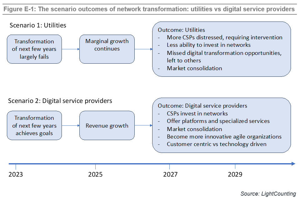 In the latest Network Transformation report, LightCounting defines two scenarios that bound the possible outcomes: Scenario 1 is where CSPs become utilities while Scenario 2 sees CSPs transform into Digital Service Providers.